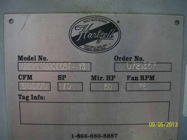 • 150 HP Hartzell Blower rated for 60,000 CFM @ 7″ SP