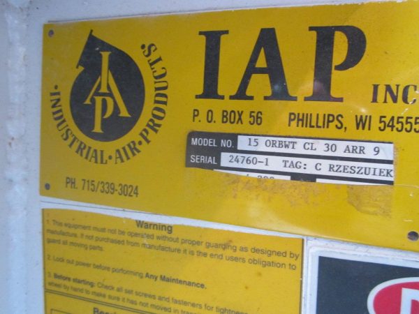 Used IAP Model 15 ORBWT CL 30 Arr 9 30 HP Material Handling Fan Note: See Fan Curve Photo Current Set Up 5,500 CFM @ 8″ S.P. 15″ Inlet Diameter 1773 RPM 230/460V 3 PH