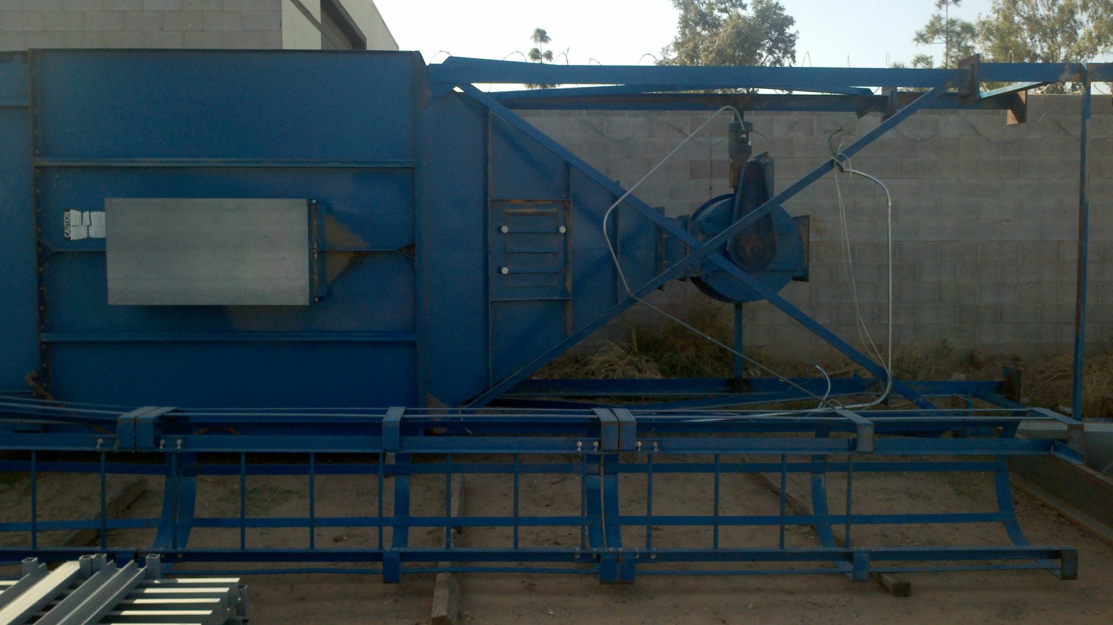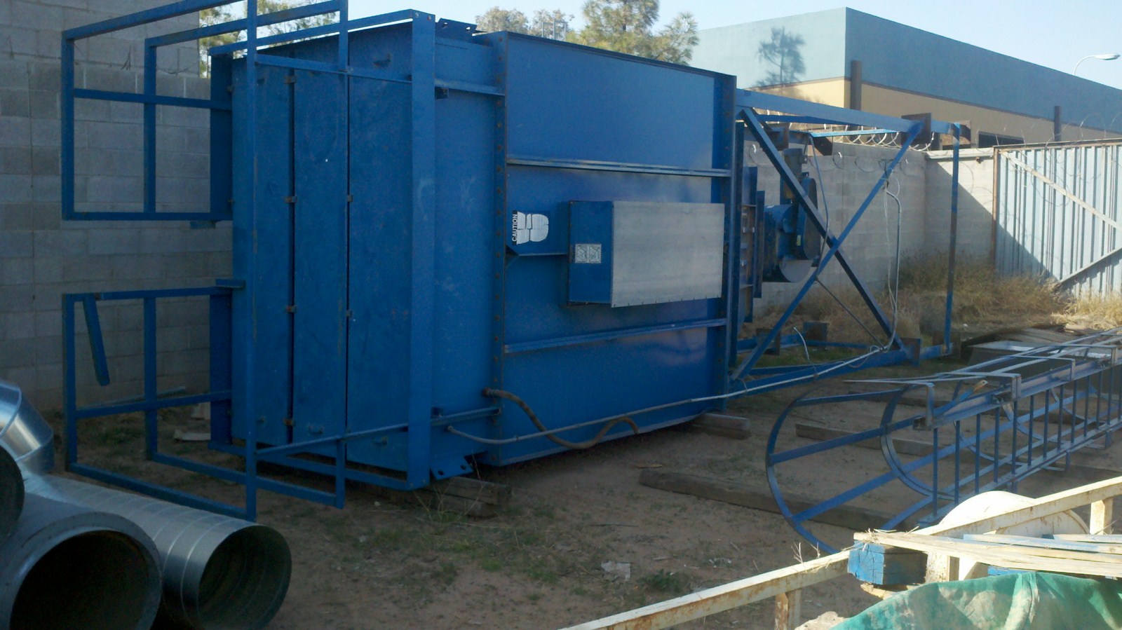 9600 CFM @ 10:1 Air-To-Cloth Ratio 954 Sq. Ft. Cloth Area from (96) 8′ Bags Automatic pulse cleaning from shop air Top loading Steel Support Structure Explosion Panel Rotary Airlock Discharge Caged Safety Ladder and Safety Railing Motor starter/control panel in enclosure 40 HP Ground Mount Blower & Connecting Ductwork FOB:AZ